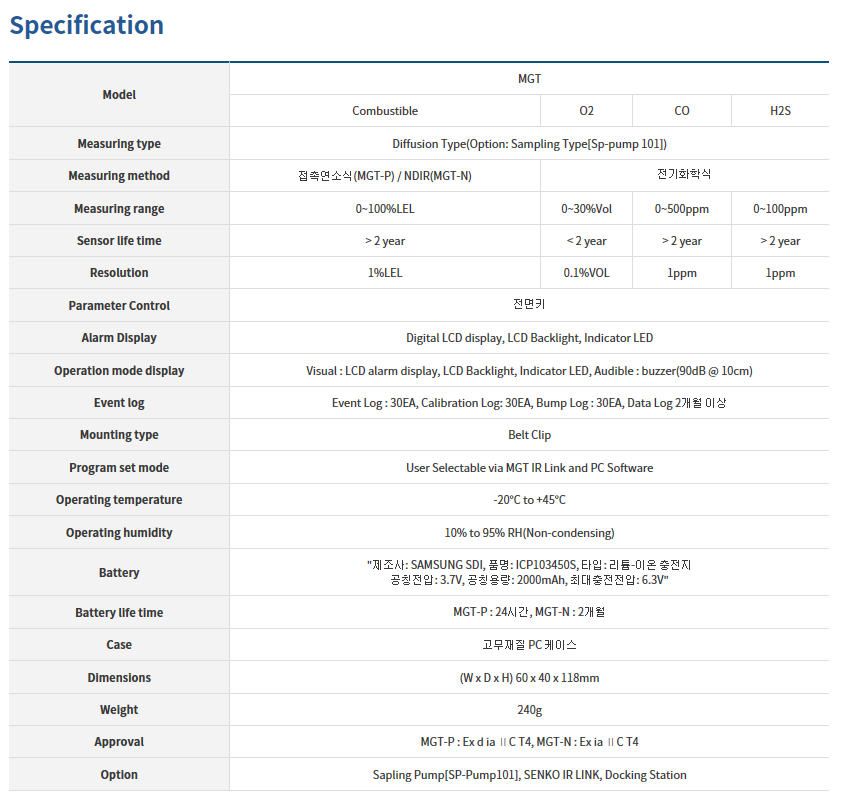 <SENKO> 복합 가스 검지기 MGT는 대기 중의 가스 관련 위험한 환경을 사용자가 인지할 수 있도록 경보하여 주는 휴대용 복합가스 검지기 입니다. LCD 화면을 통해 4가지 가스(산소, 일산화탄소, 황화수소, 가연성가스)의 농도를 한번에 표시하며, 작동 방법이 편리하고 간단합니다.